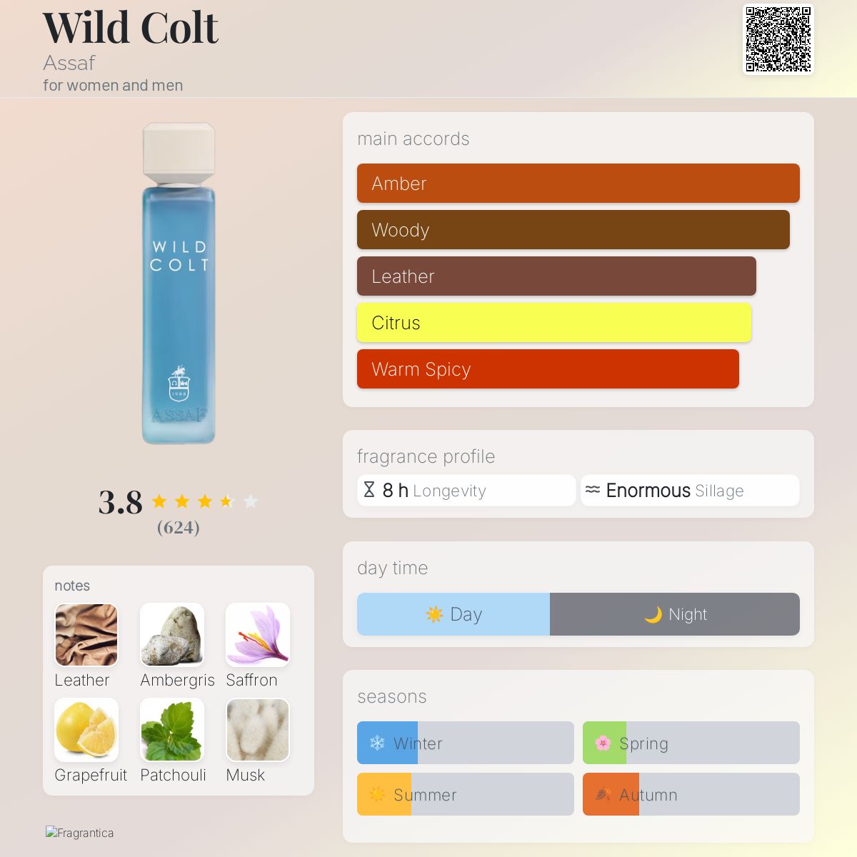 عطر وايلد كولت من أساف هو عطر شرقي خشبي للجنسين. أُطلق عطر وايلد كولت عام ٢٠٢٢. تتكون مقدمة العطر من الزعفران والجريب فروت والبرغموت والفلفل الوردي والنعناع؛ أما قلب العطر فيتكون من الجلد والباتشولي ونجيل الهند واللابدانوم؛ بينما تتكون قاعدة العطر من العنبر والمسك وطحلب السنديان وخشب العنبر.